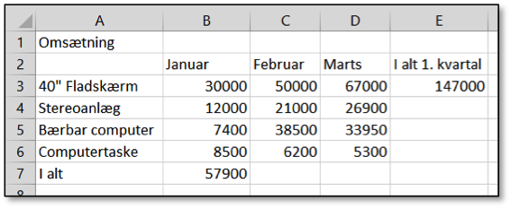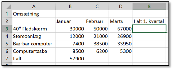 I dette eksempel viser vi, hvordan tallene i række 3 bliver lagt sammen i kolonne E.