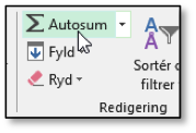 Markøren stilles der, hvor resultatet ønskes, hvorefter der klikkes på Autosum ikonet, der findes på fanen HJEM. Den kan også findes på fanen formler.