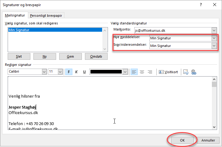 Du kan oprette flere signaturer, hvis du finder behov for det. Og i felterne Nye meddelser og Svar/videresendelser, kan du vælge, hvilke signaturer, der skal bruges til nye og de meddelser du Besvarer/videresender.