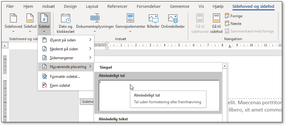 - Klik på menuen Sidetal og vælg ønsket sidetal (her valgt Nuværende placering og Almindeligt tal):