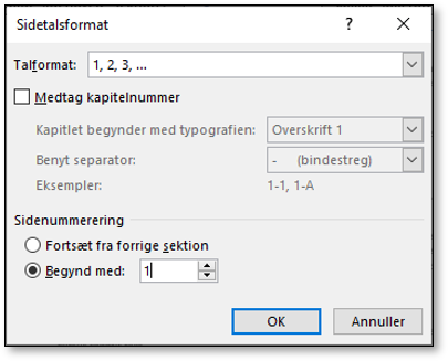 - Højreklik på sidetallet, vælg Formatér sidetal… og vælg at sidenummereringen