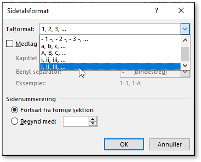 - vælg Formatér sidetal… På rullelisten Talformat vælger du »I, II, III, …«: