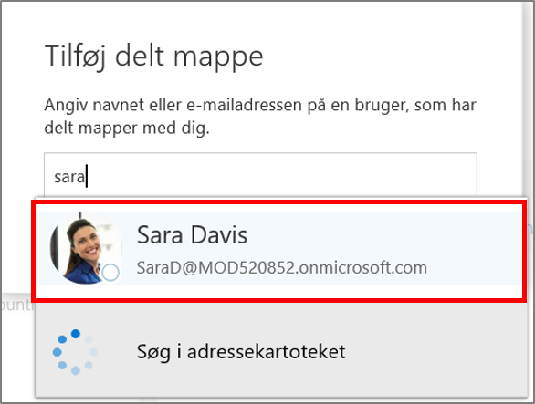 I nedenstående vindue skriver du navn eller e-mailadresse på den postkasse, du vil tilføje. Klik på det navn, der kommer frem: